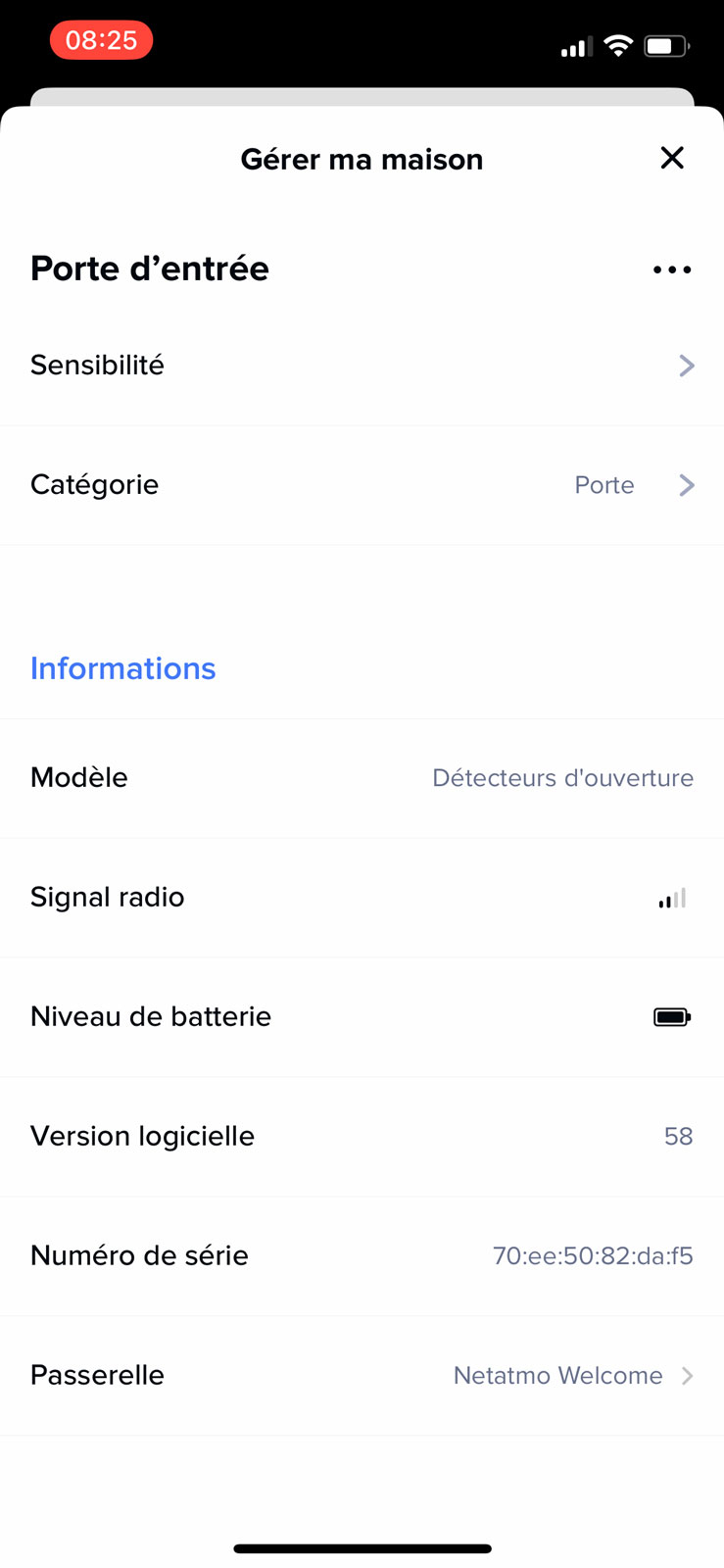 Réglages d'un capteur de porte Netatmo.